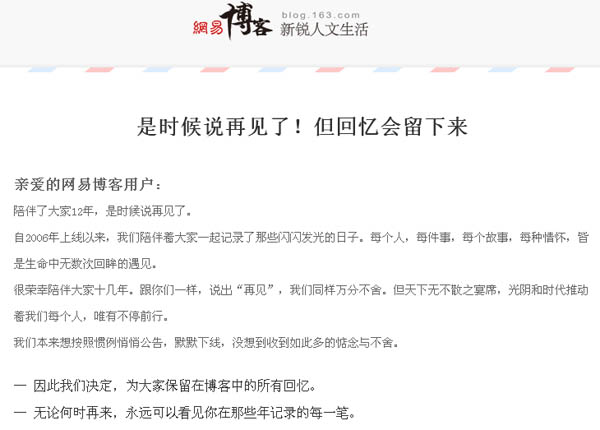 網(wǎng)易博客至2006年9月1日上線至今,已經(jīng)整整運(yùn)營(yíng)了12個(gè)年頭。對(duì)于這次的突然關(guān)閉,雖然網(wǎng)易沒有聲明原由,但真實(shí)情況,你我都明白!